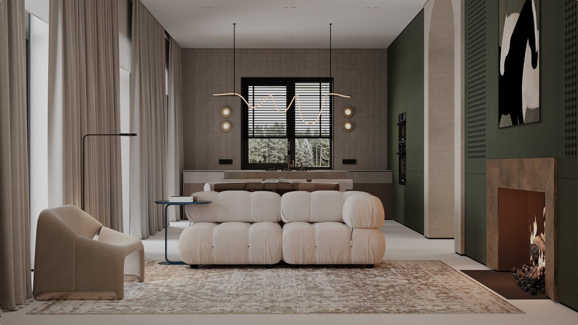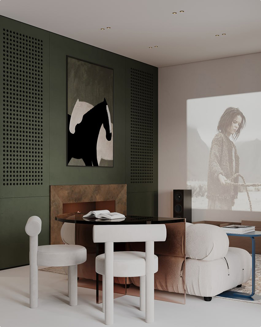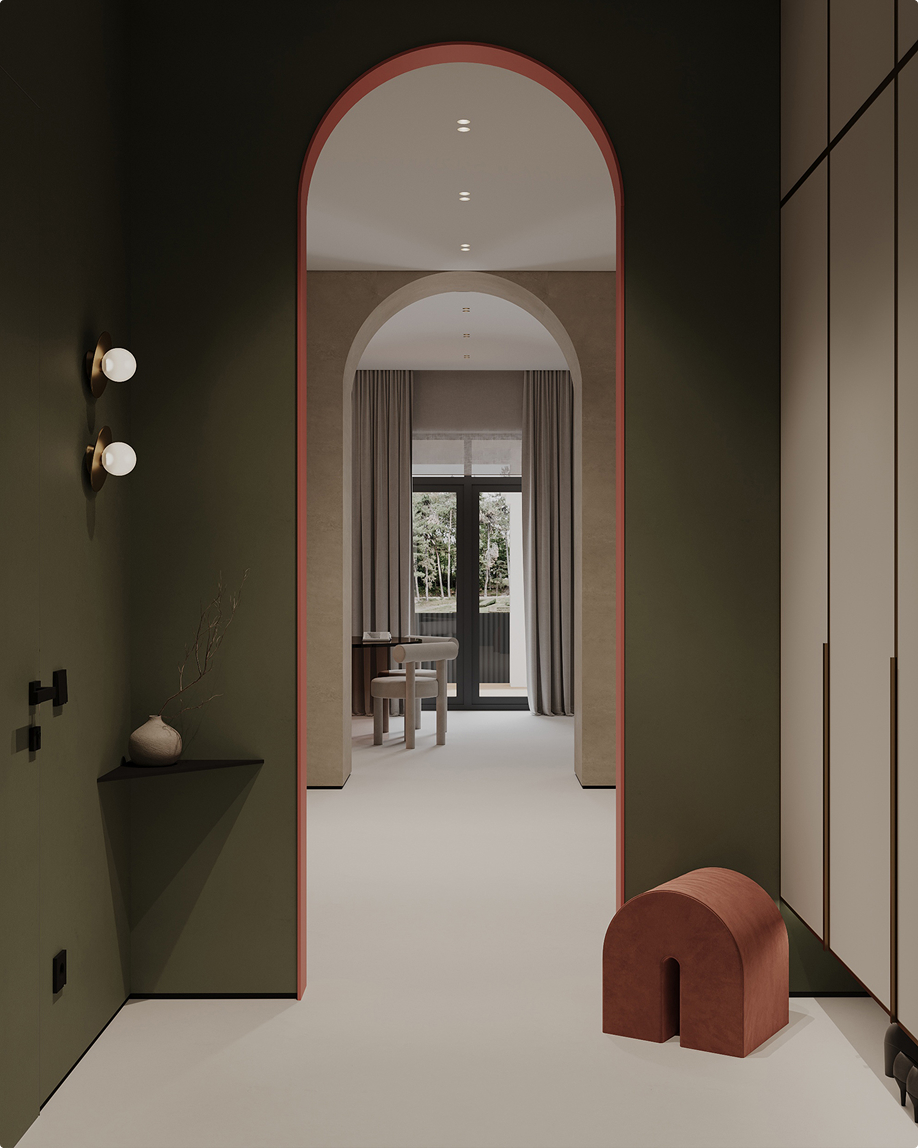 Интерьер основан на самовыражении через цвет и фактуру. Благородные и насыщенные оттенки, принты и тактильные поверхности объединены в эстетике тихой роскоши. Сочетание состаренной меди камина и глубокого зелёного, перфорированные панели, барная стойка под камень, винная комната и яркий акцент в гостевом санузле формируют характер пространства. Мягкие арки и скруглённые переходы добавляют пластичности, а авторские детали усиливают индивидуальность проекта.