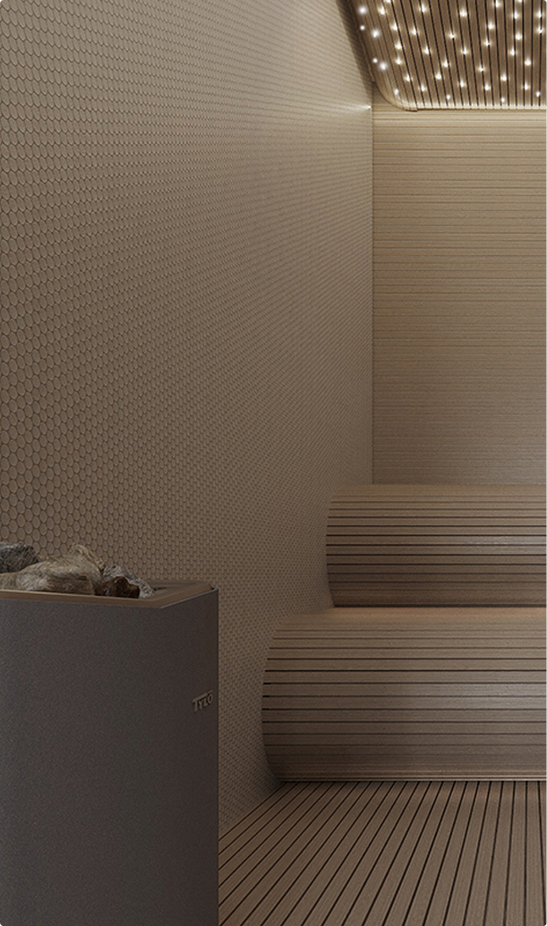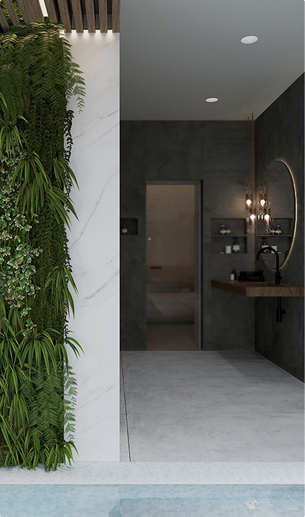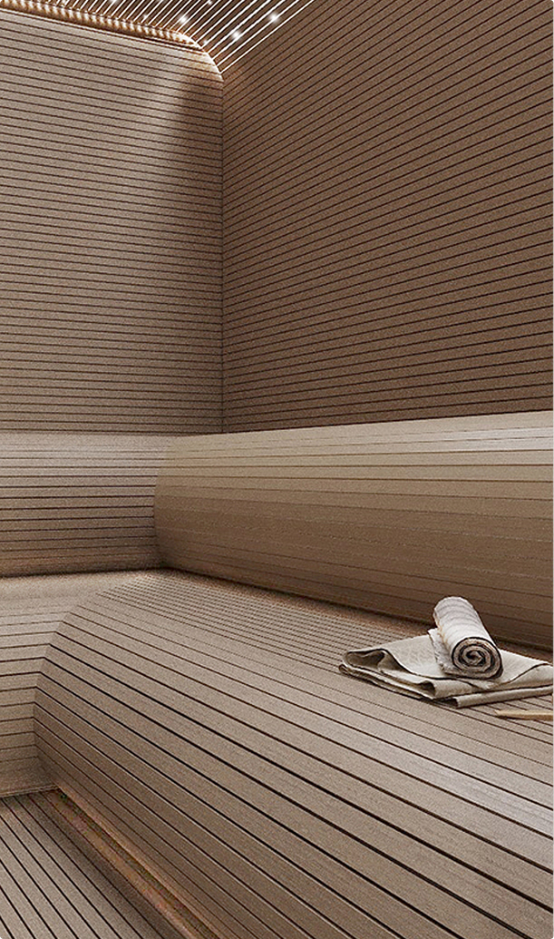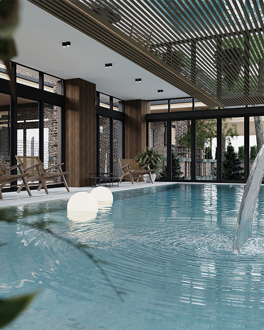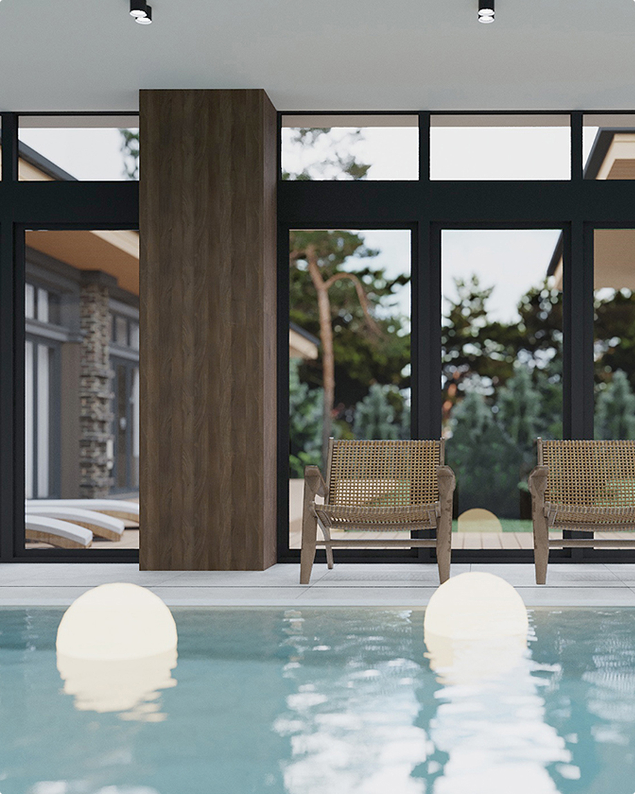 Планировка включает бассейн, гостевую спальню, мини-бар и общее пространство для встреч и камерных мероприятий. Центральная зона раскрывается на террасу в сосновом бору, создавая ощущение уединения и прямого контакта с природой. Дом работает как приватное продолжение основного объёма — место для отдыха, восстановления и неспешного общения в окружении ландшафта.