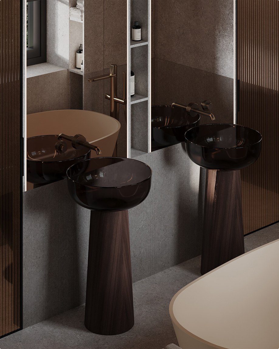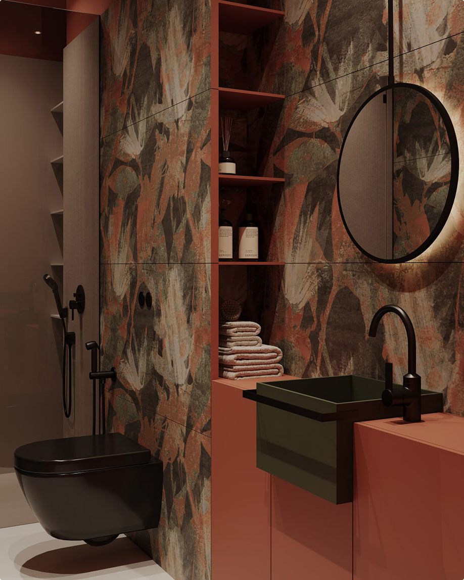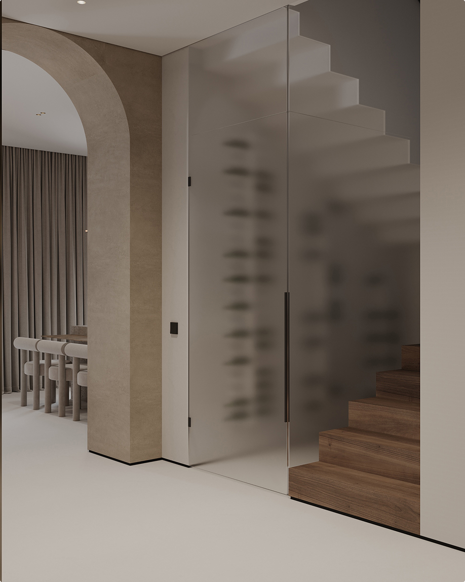 Интерьер основан на самовыражении через цвет и фактуру. Благородные и насыщенные оттенки, принты и тактильные поверхности объединены в эстетике тихой роскоши. Сочетание состаренной меди камина и глубокого зелёного, перфорированные панели, барная стойка под камень, винная комната и яркий акцент в гостевом санузле формируют характер пространства. Мягкие арки и скруглённые переходы добавляют пластичности, а авторские детали усиливают индивидуальность проекта.